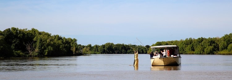 Escape the heat and relax in air-conditioned comfort as your knowledgeable crew takes you on a journey down the murky waters of the Adelaide River. Be thrilled and awed by the sight of huge prehistoric beasts leaping high out of the water right alongside the boat!